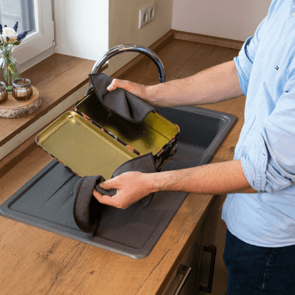 Dopo il lavaggio delle stoviglie, appoggiare il Panno per stoviglie sopra il portastoviglie. Il panno assorbe l’acqua residua evitando il passaggio di lucidatura.