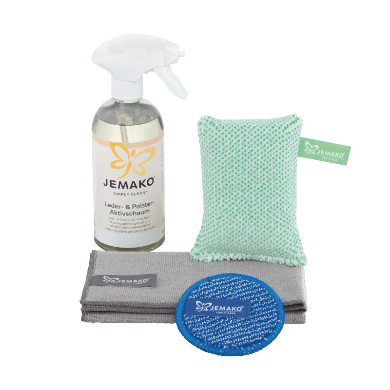 Das zu reinigende Polster bei Bedarf mit dem blauen DuoPad gründlich von Flusen oder Tierhaaren befreien. Dann den Leder- & Polster-Aktivschaum auf den feuchten Schwamm sprühen und die Fläche in kreisenden Bewegungen reinigen. Anschließend mit dem feuchten Profituch nachwischen und trocknen lassen.