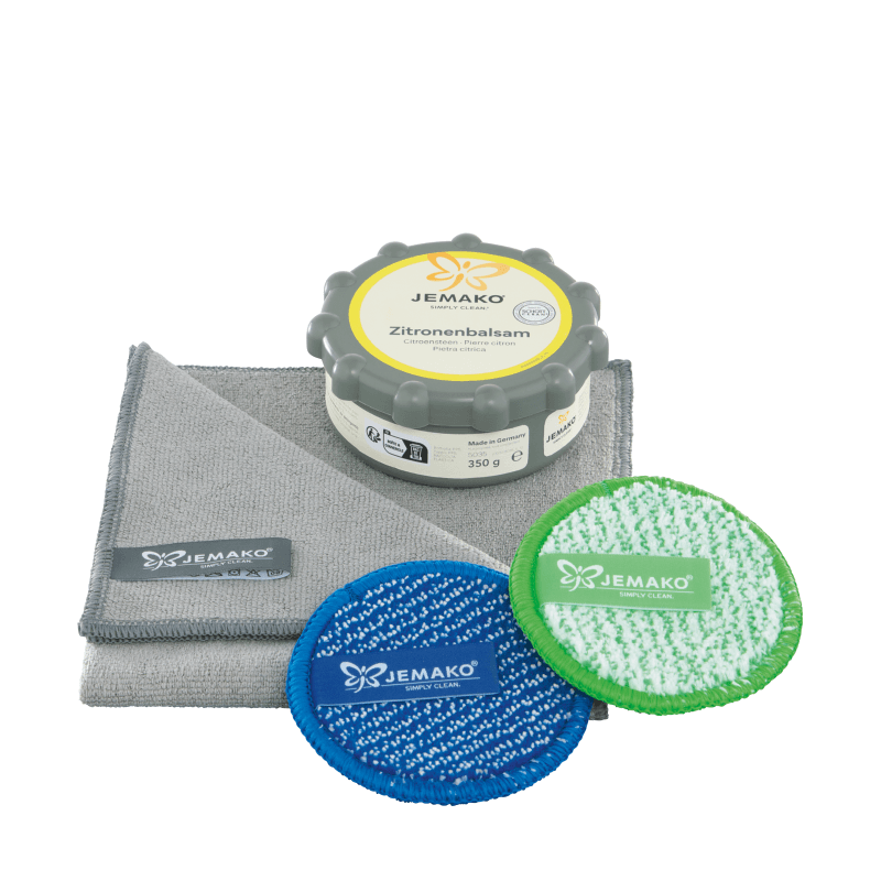 Den Zitronenbalsam mit dem feuchten DuoPad (grün bei leichten und blau bei hartnäckigen Verschmutzungen) aufschäumen und die Oberfläche in kreisenden Bewegungen reinigen. Produktreste mit dem feuchten Profituch aufnehmen und anschließend mit einem JEMAKO Trockentuch trocknen.