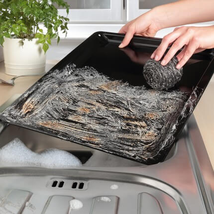 Décoller les salissures rebelles et restes de graisse avec l’éponge spirale inox ou le DuoPad gris, les éliminer ensuite avec beaucoup d’eau. Après emploi, bien rincer le DuoPad et l’éponge spirale inox professionnelle.