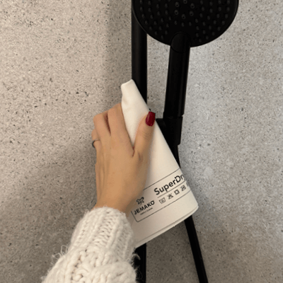 Auch für Armaturen empfehlen wir einen Sanitärreiniger, der sich besonders gut eignet, um leichte Kalkverschmutzungen zu entfernen. Ihre Duscharmatur reinigen Sie mit etwas Reiniger und der Reinigungsfaser in kurzer Zeit. Damit keine Rückstände auf den Armaturen bleiben, sollten Sie diese nach dem Reinigen abspülen und dann mit einem Abledertuch trocknen.