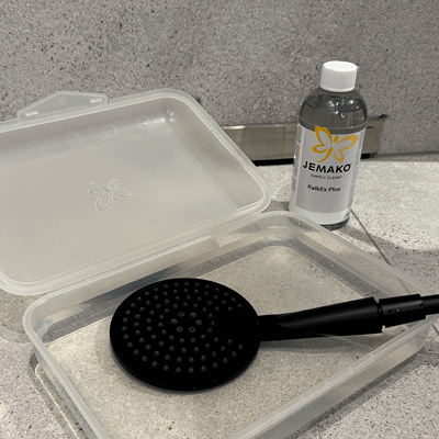 Damit Handbrause und Duschkopf ihre Funktion behalten, ist es wichtig, auch diese regelmäßig von Kalk zu befreien. Für Tiefenwirkung empfehlen wir es, die Handbrause abzuschrauben und sie eine gute halbe Stunde in eine Lösung zur Entkalkung (z.B. mit KalkEx) zu legen. Dadurch lösen sich auch größere Ablagerungen. Falls sich die Kopfbrause nicht lösen lässt, kann die Kalklösung auch mit einem Tuch aufgetragen werden.