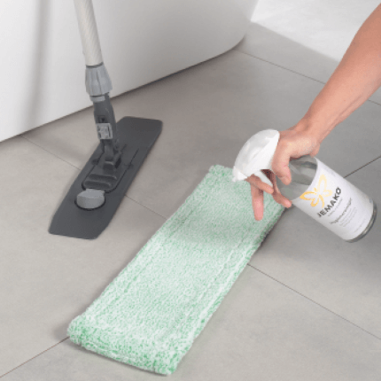 Vaporiser sur le chiffon pro JEMAKO sec et essuyer les surfaces à nettoyer. Pour nettoyer les sols de salle de bains, vaporiser simplement le nettoyant hygiénique directement sur la fibre pour sol verte à fibres courtes sèche et essuyer le sol. Dans les deux cas, il n’est pas nécessaire d’essuyer à nouveau.