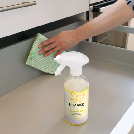 - Spruzzare il Detergente forte a scelta sul Panno professionale, sul Panno lavastoviglie o su una fibra verde JEMAKO e pulire la superficie. Sciacquare o passare un panno bagnato – ecco fatto!