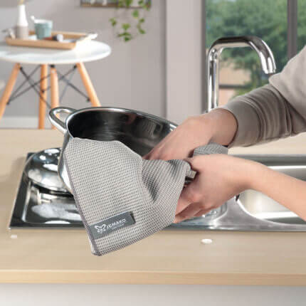 S’utilise sec pour sécher les surfaces et objets non sensibles. Le torchon de cuisine est parfait pour les plus gros objets comme les verres, poêles, casseroles, etc.