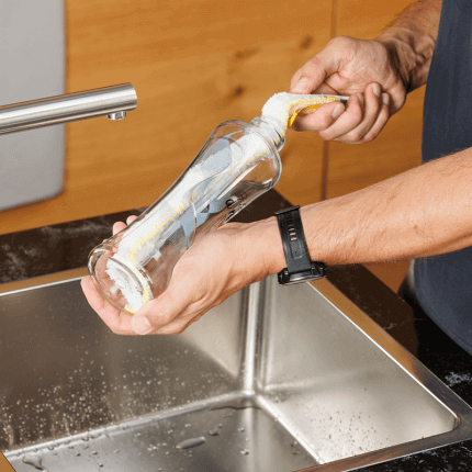 Maak eerst de Flessenbutler met de Reinigingsvezel nat onder de kraan. Stroop het overtollige water eraf met je hand, zodat het niet meer drupt. Steek de Flessenbutler met een omgevouwen vezelpunt in de fles. Houd de fles horizontaal en laat hem gewoon rusten op de Flessenbutler. Draai de fles met je hand bij de bodem van de fles langzaam rond. Reinig daarna afhankelijk van de vorm van de fles ook de flessenhals met de flexibele punt. Spoel de vezel en de fles vervolgens kort na. Droog vervolgens de binnenkant van de fles op dezelfde manier met de Droogvezel. Het kleine beetje vocht dat nog resteert, verdampt snel.