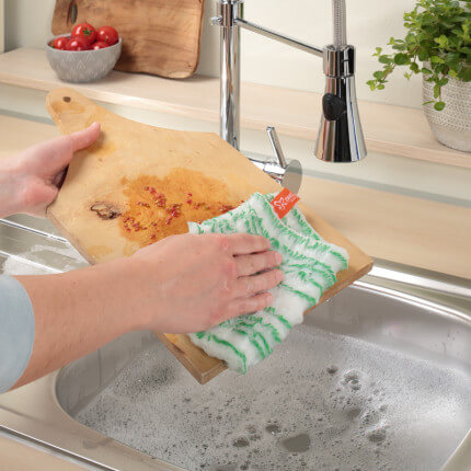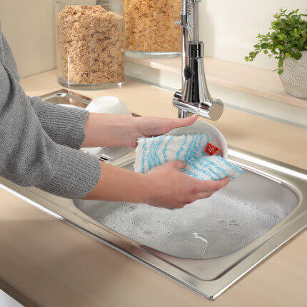 - Sparsam und umweltfreundlich: Der Verbrauch von Spülmittel kann auf ein Minimum reduziert werden, da nur das Spültuch bereits eine Menge an Fett- und Schmutz entfernt.