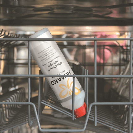 - Impiego in lavastoviglie: svitare il tappo rosso e rimuovere la pellicola di protezione. Inserire la bottiglia a testa in giù nel cestello delle posate o in uno scomparto vuoto dalla lavastoviglie vuota. Quindi eseguire un lavaggio a temperatura possibilmente alta (min. 55 °C). La macchina è utilizzabile subito dopo l’uso. Uso consigliato: ogni 2 – 3 mesi.