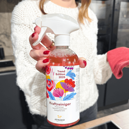 - Kraftreiniger nach Wunsch auf ein Profituch, Spültuch oder eine grüne JEMAKO Faser sprühen und die gewünschte Oberfläche reinigen. Abspülen oder feucht nachwischen - fertig!