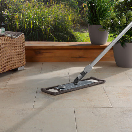Verdun voor het reinigen van oppervlakken buitenshuis de vloerreiniger intensief met water in een verhouding van maximaal 1:10, afhankelijk van het soort vuil. Breng de oplossing vervolgens aan op de vloer en laat het een paar minuten inwerken. Veeg de vloer vervolgens schoon met de grijze vloervezel. Absorbeer de vuiloplossing, laat niet opdrogen. Veeg ten slotte met helder water totdat alle reinigingsresten zijn verwijderd.