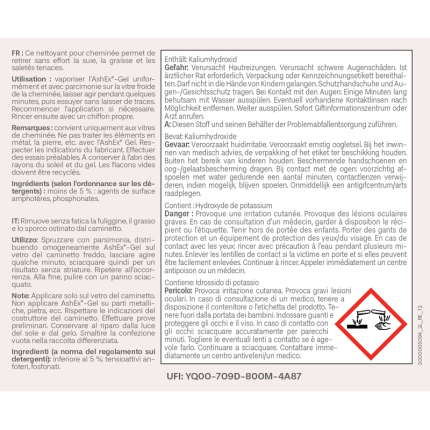 Spruzzare con parsimonia AshEx®-Gel uno strato omogeneo sul vetro del camino e lasciare agire per qualche minuto, quindi rimuovere il gel con un Panno AshEx® umido. Ripetere all’occorrenza e poi finire la pulizia con il Panno AshEx® sciacquato. Indicato solo per vetri del caminetto: non trattare metalli, pietra ecc. con AshEx®-Gel!