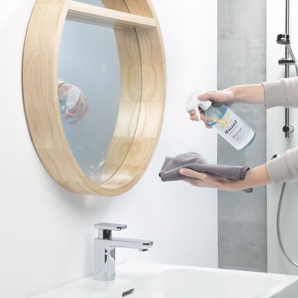 Il Detergente per vetri cancella in un baleno le ditate e i piccoli resti di grasso, regalando a vetri e specchi una lucentezza senza aloni.