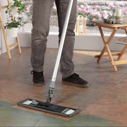 La combinazione perfetta composta da Lavapavimenti e Fibra pavimenti per superfici esterne robuste. Il nostro "sostituto della lavasciuga" JEMAKO.