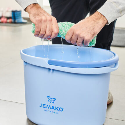 Bodenpflege ins Wischwasser geben (Dosierungsverhältnis: 1:500; z. B. 10 ml Bodenpflege (1 Verschlusskappe) in 5 l Wasser) und den Boden mit der entsprechenden Bodenfaser feucht reinigen. Anschliessend mit der weissen Bodenfaser nachwischen und das verbliebende Wasser inkl. Restschmutz aufnehmen.
