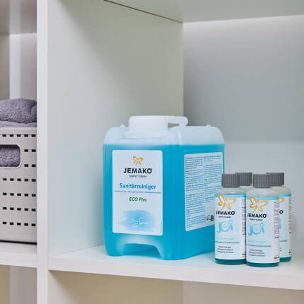 - Bei normaler Verschmutzung: Einige Spritzer Sanitärreiniger in das Putzwasser geben.
