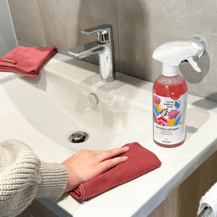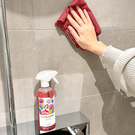- Bei starker Verschmutzung: Sanitärreiniger unverdünnt auf das feuchte Profituch geben und Oberflächen sowie Armaturen reinigen. Anschliessend gründlich nachspülen oder mit einem feuchten Profituch nachreinigen.