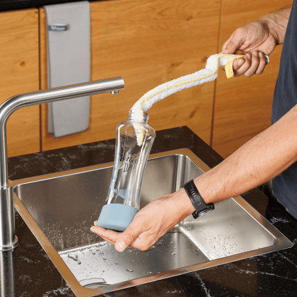 Zuerst den Sprudelbutler mit Reinigungsfaser unter dem Wasserhahn befeuchten. Überschüssige Flüssigkeit einfach mit der Hand abstreifen, damit es nicht mehr tropft. Sprudelbutler mit umgeschlagener Faserspitze in die Flasche einführen. Flasche waagerecht halten und einfach auf dem Sprudelbutler aufliegen lassen. Mit der Hand am Flaschenboden die Flasche langsam drehen. Je nach Flaschenform anschliessend den Flaschenhals mit der beweglichen Spitze reinigen. Faser und Flasche danach kurz ausspülen. Anschliessend die Flasche von innen mit der Trocknungsfaser auf die gleiche Art und Weise nachtrocknen. Minimale Restfeuchtigkeit verdunstet nach wenigen Momenten.