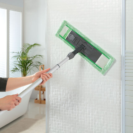 Voeg Vloeronderhoud toe aan het dweilwater (doseerverhouding: 1:500; bijv. 10 ml Vloeronderhoud (1 dopje) in 5 liter water) en maak de vloer kort vochtig schoon met de groene vloervezel. Veeg vervolgens met de witte vloervezel en neem het resterende water en vuil op.