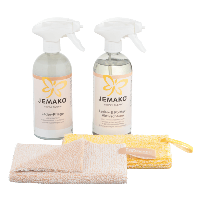 Das perfekte Set für die schnelle, gründliche Reinigung und Pflege von Glattleder-Oberflächen.