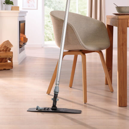 Aggiungere detergente per pavimenti all'acqua di lavaggio (rapporto di dosaggio: 1:500; ad es. 10 ml di detergente di pavimenti (1 tappo) in 5 litri d'acqua) e pulire brevemente il pavimento con la fibra verde. Quindi passare la fibra bianca per assorbire l'acqua e lo sporco rimanenti.