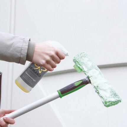 A seconda del grado di sporco, diluire con acqua in un rapporto tra 1:1 e 1:10 e quindi trattare le superfici con il Pulivetri o il Lavapavimenti JEMAKO procedendo dal basso verso l’alto. Lasciare agire circa 1-2 minuti, non lasciare asciugare. Quindi sciacquare con acqua abbondante. Dopo la pulizia di base si consiglia di completare il trattamento lavando il veicolo con l’Autoshampoo ad effetto specchio di JEMAKO.