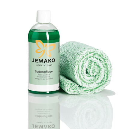 Bodenpflege ins Wischwasser geben (Dosierungsverhältnis: 1:500; z. B. 10 ml Bodenpflege (1 Verschlusskappe) in 5 l Wasser) und den Boden mit der entsprechenden Bodenfaser feucht reinigen. Anschliessend mit der weissen Bodenfaser nachwischen und das verbliebende Wasser inkl. Restschmutz aufnehmen.