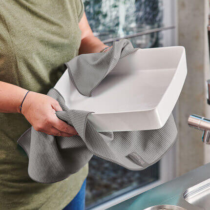 Na elke afwas de Theedoek over de bovenste servieslade leggen. De doek neemt resterend water op en het serviesgoed hoeft niet meer te worden opgewreven.