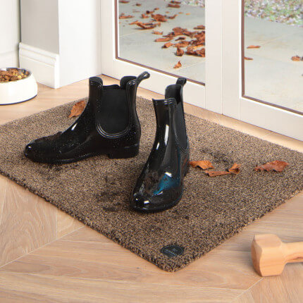 - De mat is in principe ontwikkeld voor binnenruimtes. Als de mat buiten wordt gelegd, moet hij overdekt liggen. Dan voorkom je dat hij zich volzuigt met water als het regent!