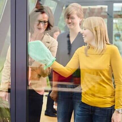 Die Fenster mit dem nassen Reinigungshandschuh reinigen und mit dem Profituch vortrocknen. Das Trockentuch sorgt abschließend für streifenfreien Glanz.