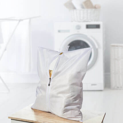 Um das Gewebe möglichst effektiv und dabei dennoch so schonend wie möglich zu waschen, empfehlen wir die Verwendung unserer Waschsäcke. Die Waschsäcke mit verschiedenfarbigen Zipperabdeckungen unterscheiden sich nicht in ihrer Funktion. Die Farben helfen bei der richtigen Wäschetrennung.